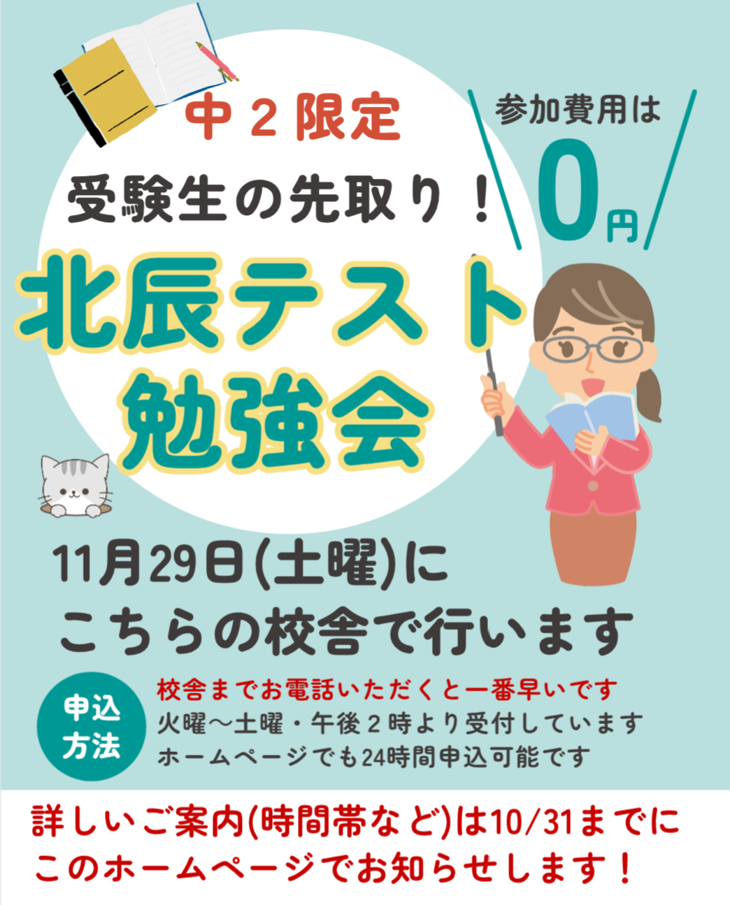 詳しいご案内、料金などが気になる方はどうぞ「入塾説明会」にご参加ください。平日でも土曜日でも行います。