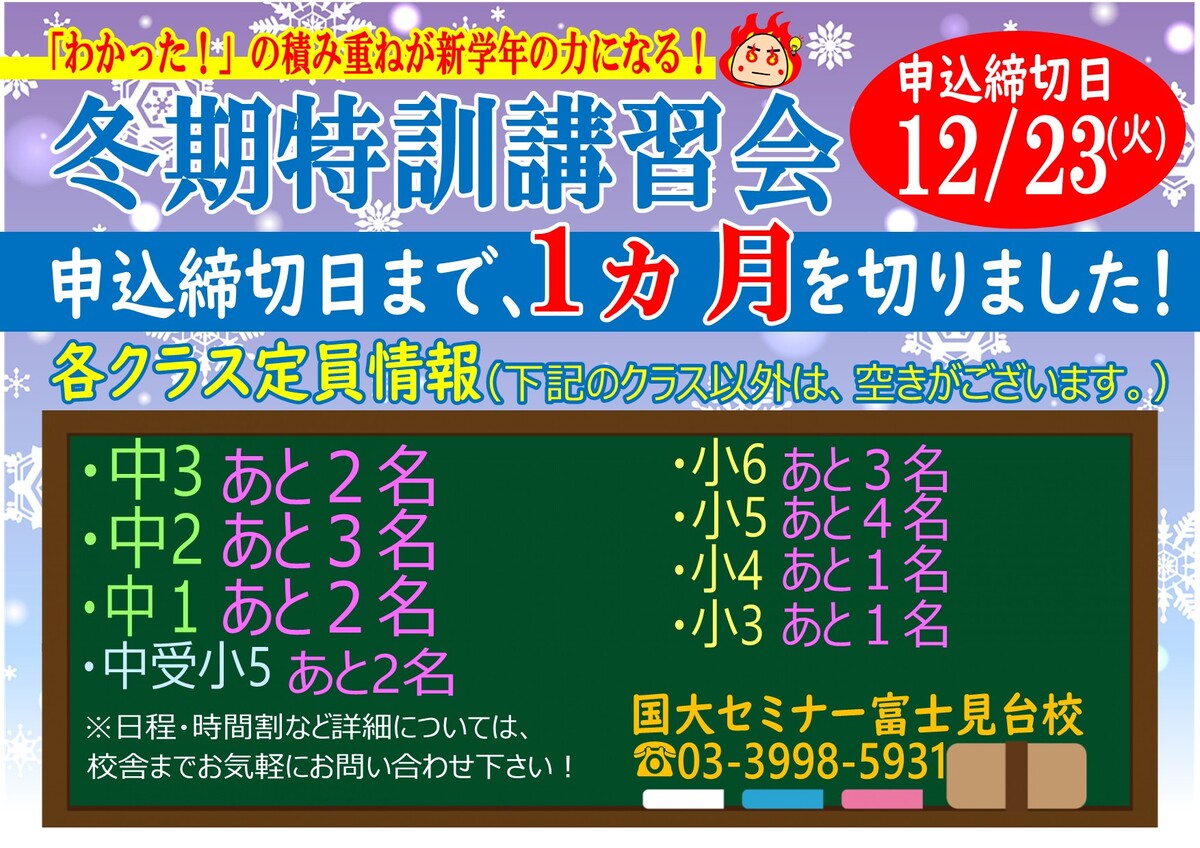 新中1(現小6生)の方は、冬の講習会と同時申込で授業料が2ヶ月0円となります!
