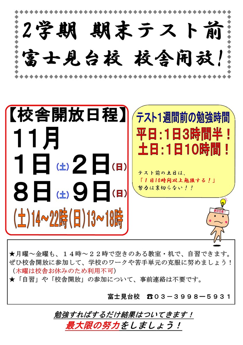 富士見台校では、テスト前恒例の校舎開放を実施します!
