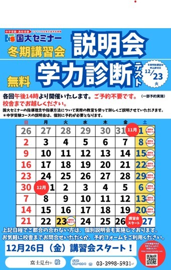 国大セミナーでは冬期講習会が12月26日(金)からスタートします!