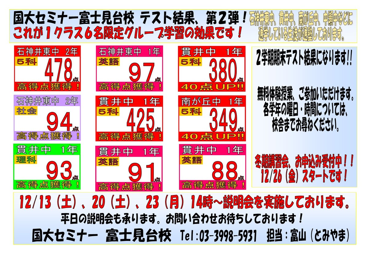 富士見台校、期末テスト結果 第2弾です!