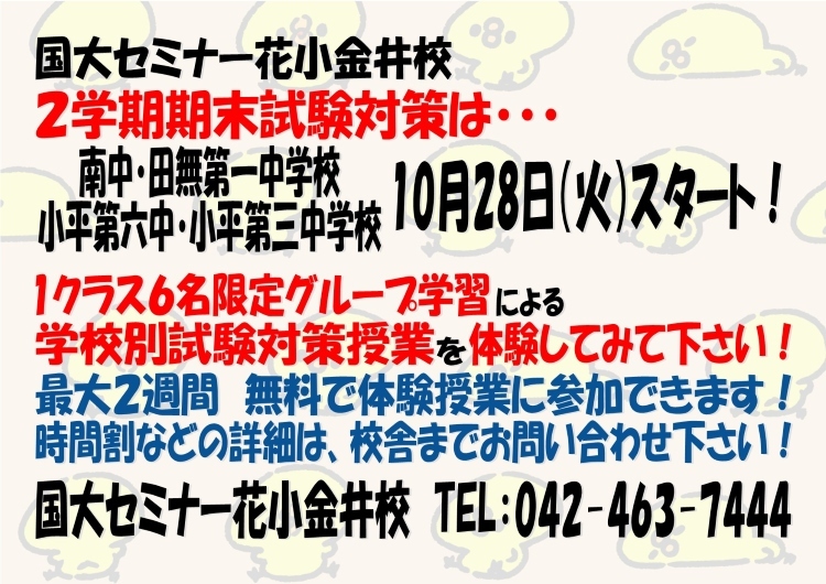 2学期の定期試験、また受験に向けて、国大セミナーで一緒に勉強しましょう。
