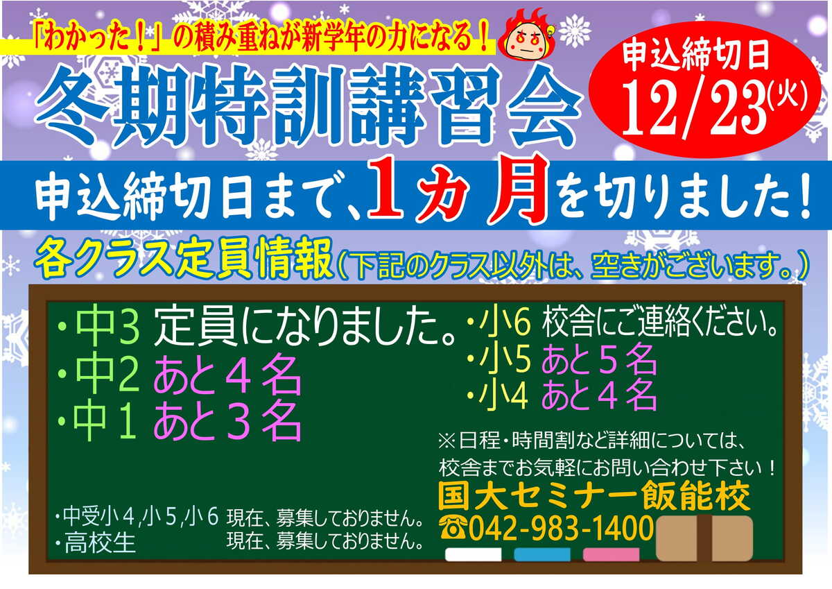 さらに、冬期講習会をご受講の上で、入塾いただいた方には、「2ヶ月間の授業料無料」となるキャンペーンを実施中です。