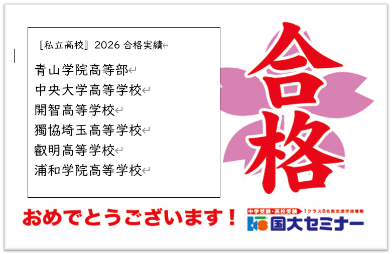 東越谷にお住まいのみなさまへ、国大セミナー東越谷校より私立高校全員合格 のご報告となります。東越谷校にお通いの、東中・中央中の生徒さんのみ 掲載いたしました。