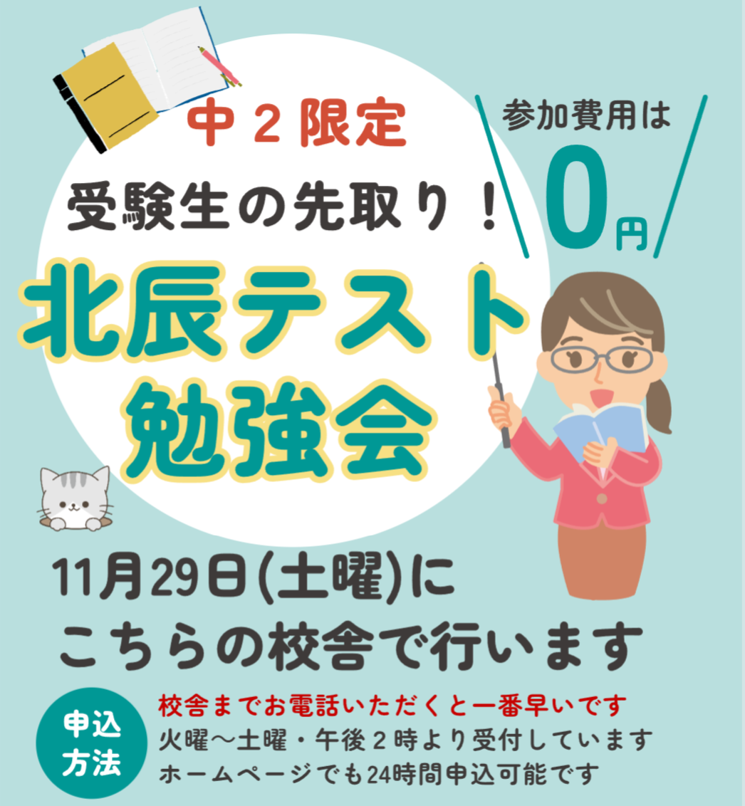 11月29日(土)に、中2生を対象とした「北辰テスト勉強会」を開催します!