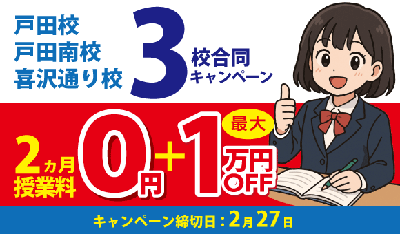 国大セミナー喜沢通り校では、戸田市校舎限定のお得な2ヶ月授業料0円キャンペーンを実施中です!