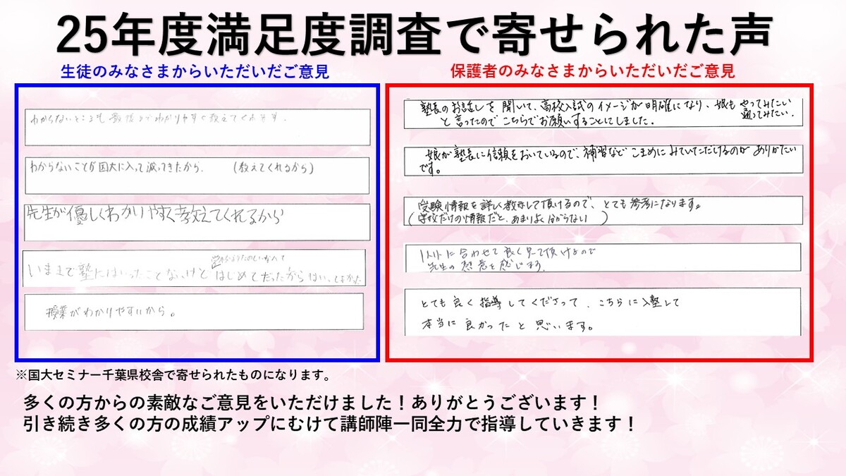 国大セミナーでは、年に1度生徒と保護者の方に満足度調査を実施しています。