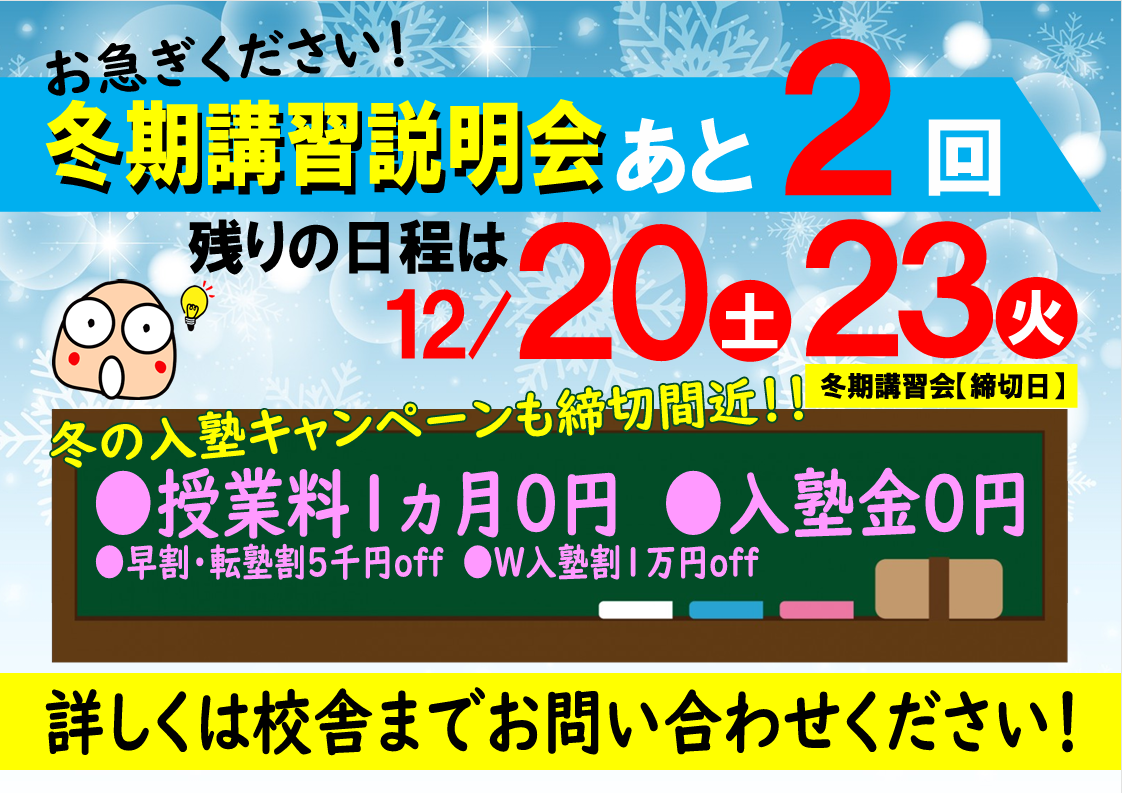 勝負の冬期特訓講習会!締切迫る!
