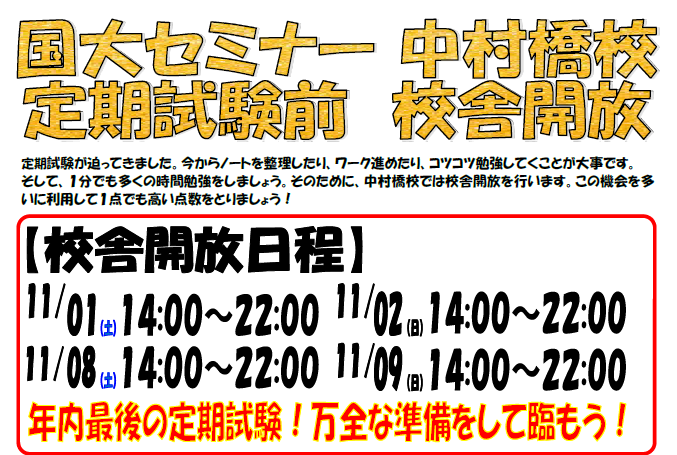 国大セミナー中村橋校では、定期試験対策授業 が始まりました。