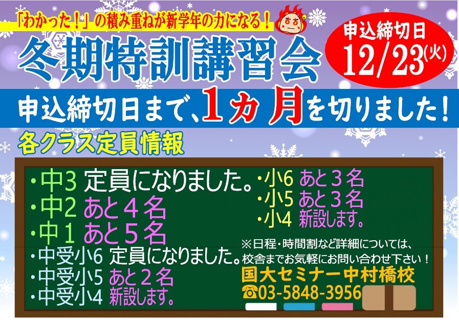 本日は、国大セミナーの冬期特訓講習会と中3・小6限定講座についてのお知らせです。