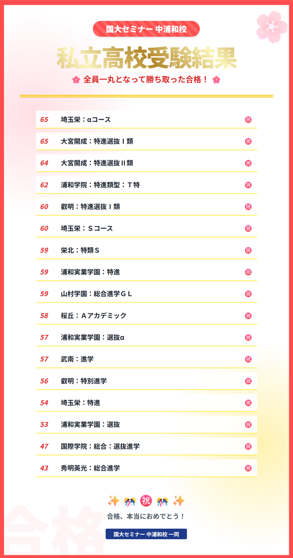 そうなんです。国大セミナー中浦和校は、第一志望校を下げさせることなく全員が合格しました!!!