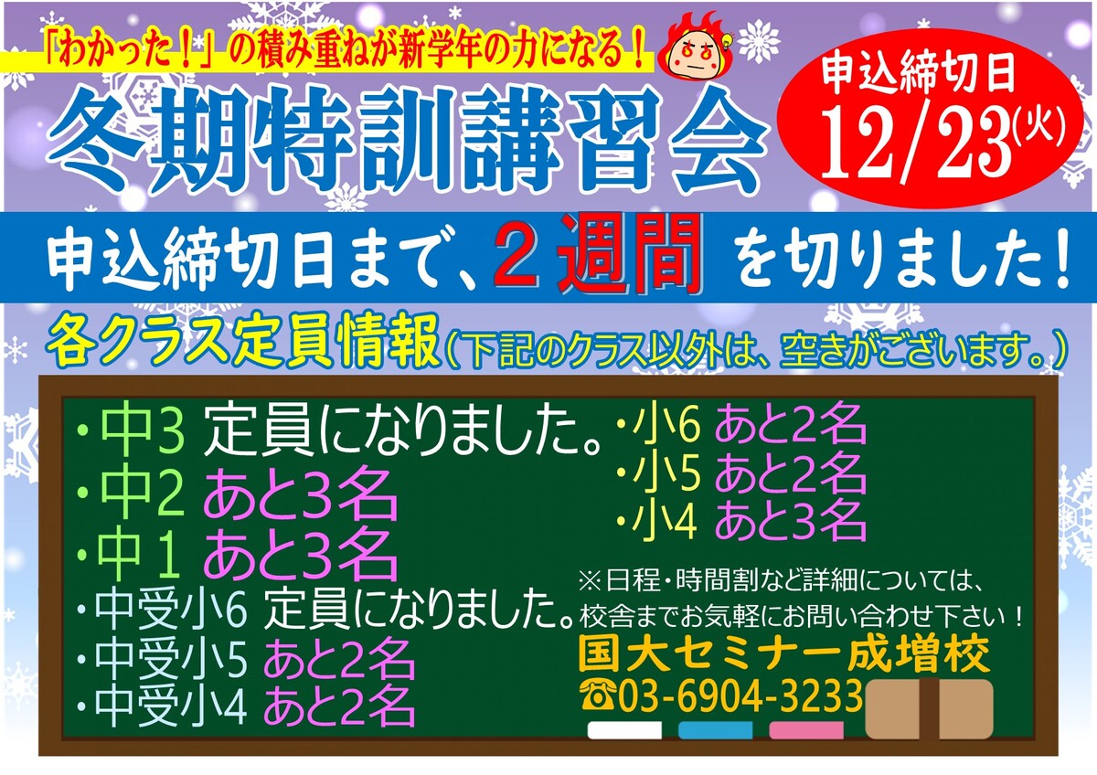 冬期特訓講習会 締切迫る