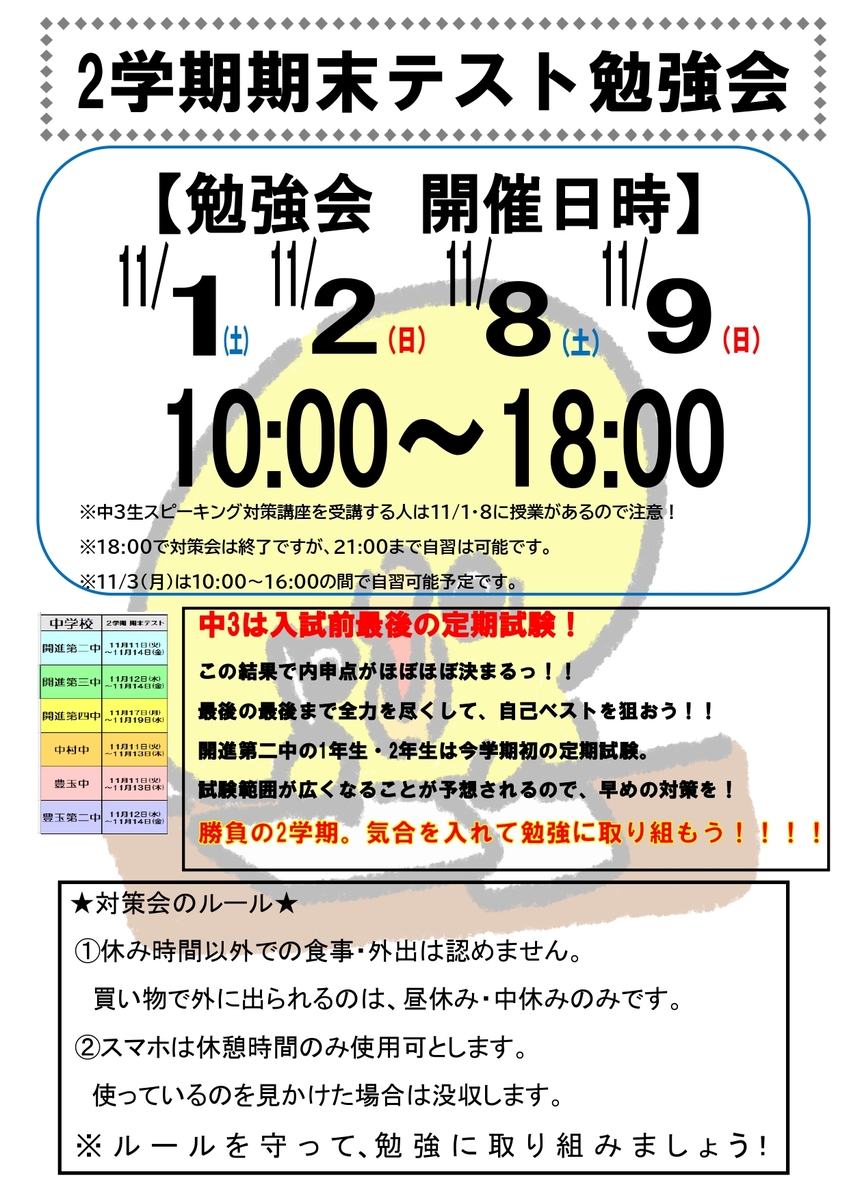 11月1日(土)・2日(日)・8日(土)・9日(日)には勉強会を実施します。
