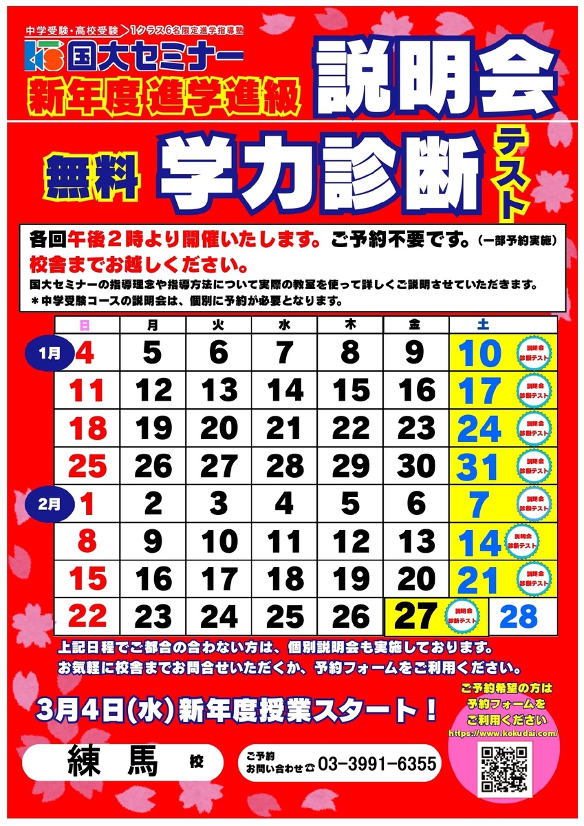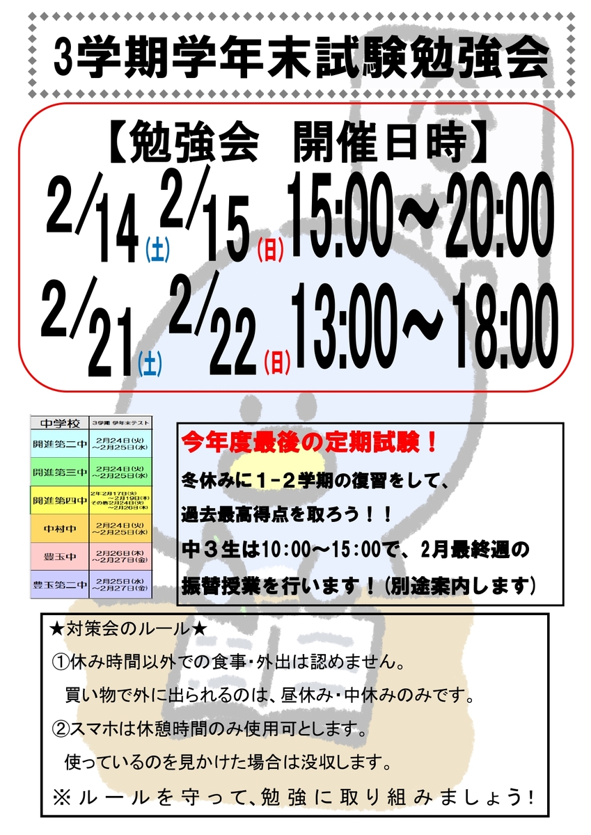 2月14日(土)・15日(日)・21日(土)・22日(日)には、勉強会も実施いたします。