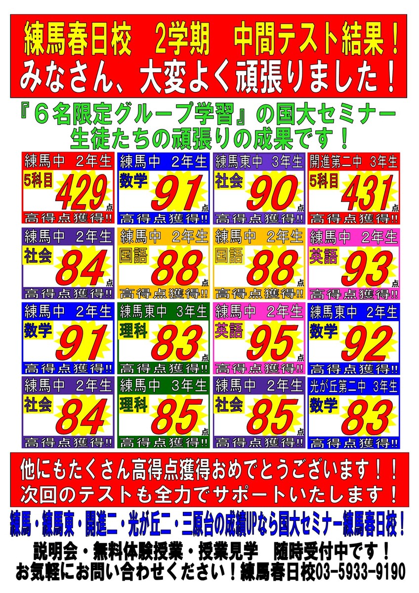国大セミナー練馬春日校の通塾生の2学期中間テスト結果が出揃いました。