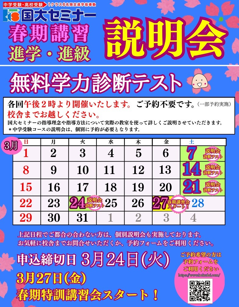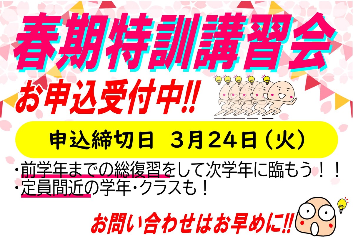 【お問い合わせはこちら】春期特訓講習会申込受付中※3/24(火)申込締切