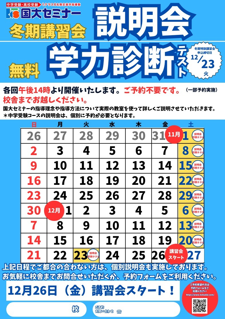 10/14(火)冬期講習会(中3ラストスパート講座含む)申し込みスタート