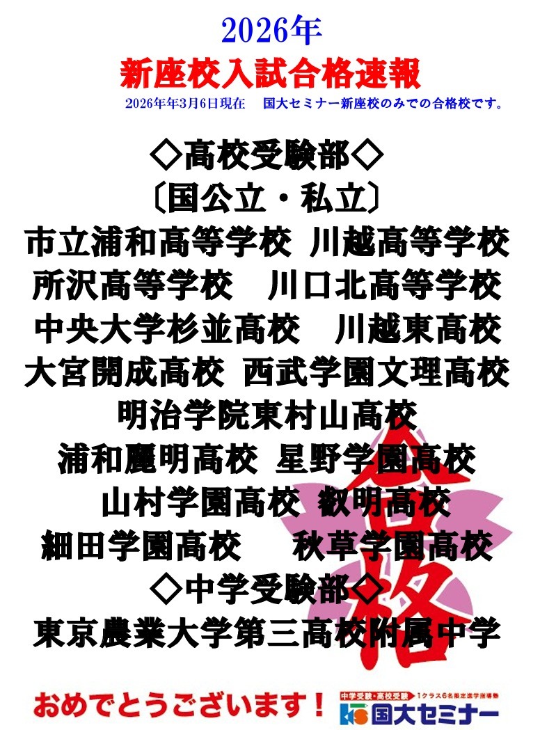 2026/03/20新座市の保護者の皆様、こんにちは。国大セミナー新座校です。