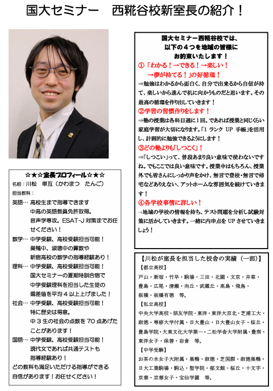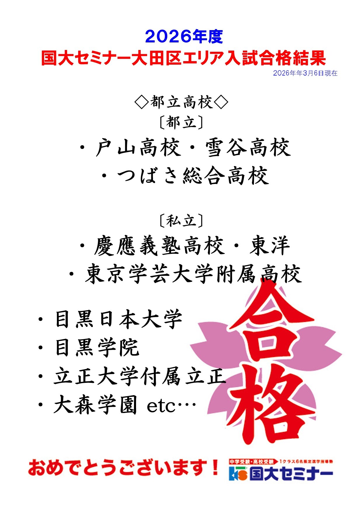 2026/03/05国大セミナー西糀谷校のHPをご覧いただき、ありがとうございます。