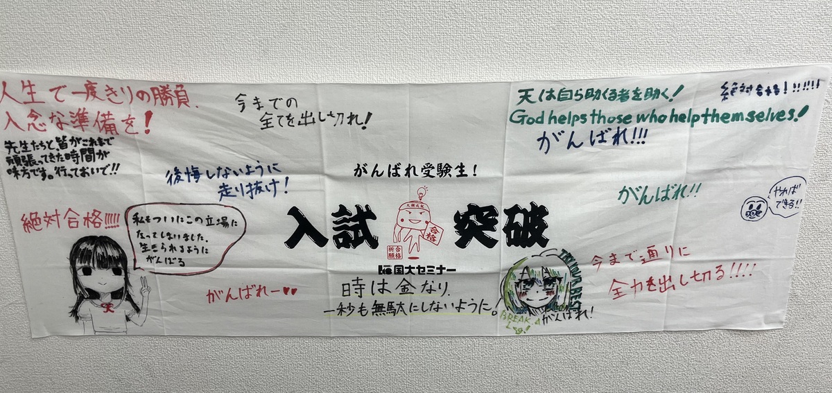 さて、校舎ではこの時期になると、【入試突破】というハチマキに