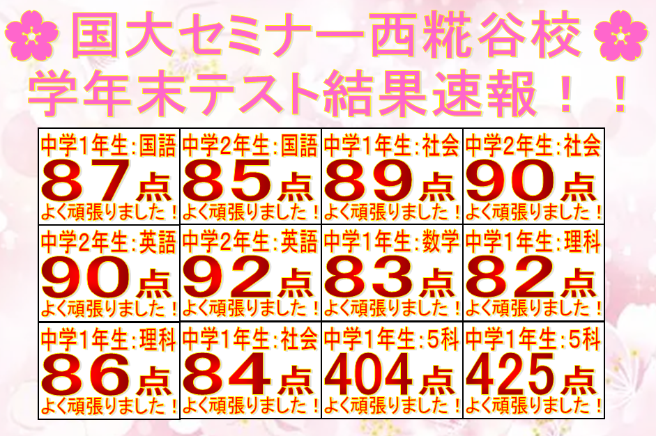 国大セミナー西糀谷校では学年末テストで素晴らしい結果を出してくれました!