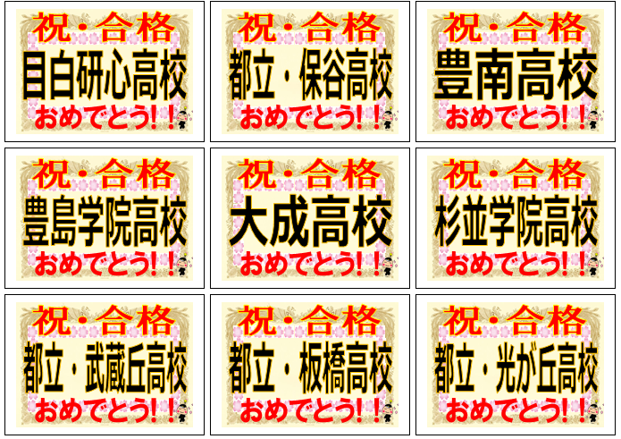 慶応志木 立教新座 埼玉平成<S特進> 山村学園<特別進学EL> 秋草学園 淑徳 中大杉並 明大中野 日大第二 日大鶴丘 日大豊山 専修大附属 東洋 淑徳巣鴨 駒込 桜丘 錦城 國學院 東京成徳 大東文化第一 豊島学院 など