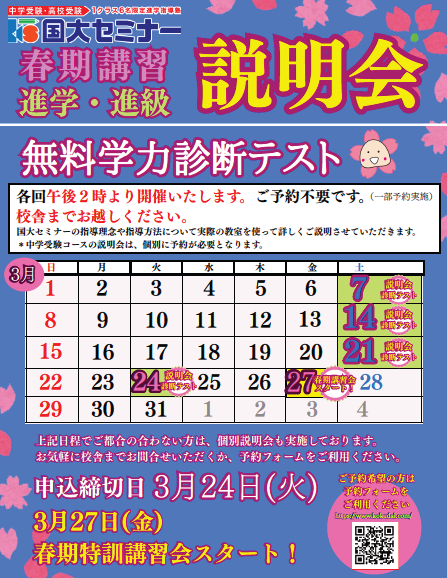 春期講習会 説明会&無料学力診断テスト 日程のお知らせ【2/25更新】