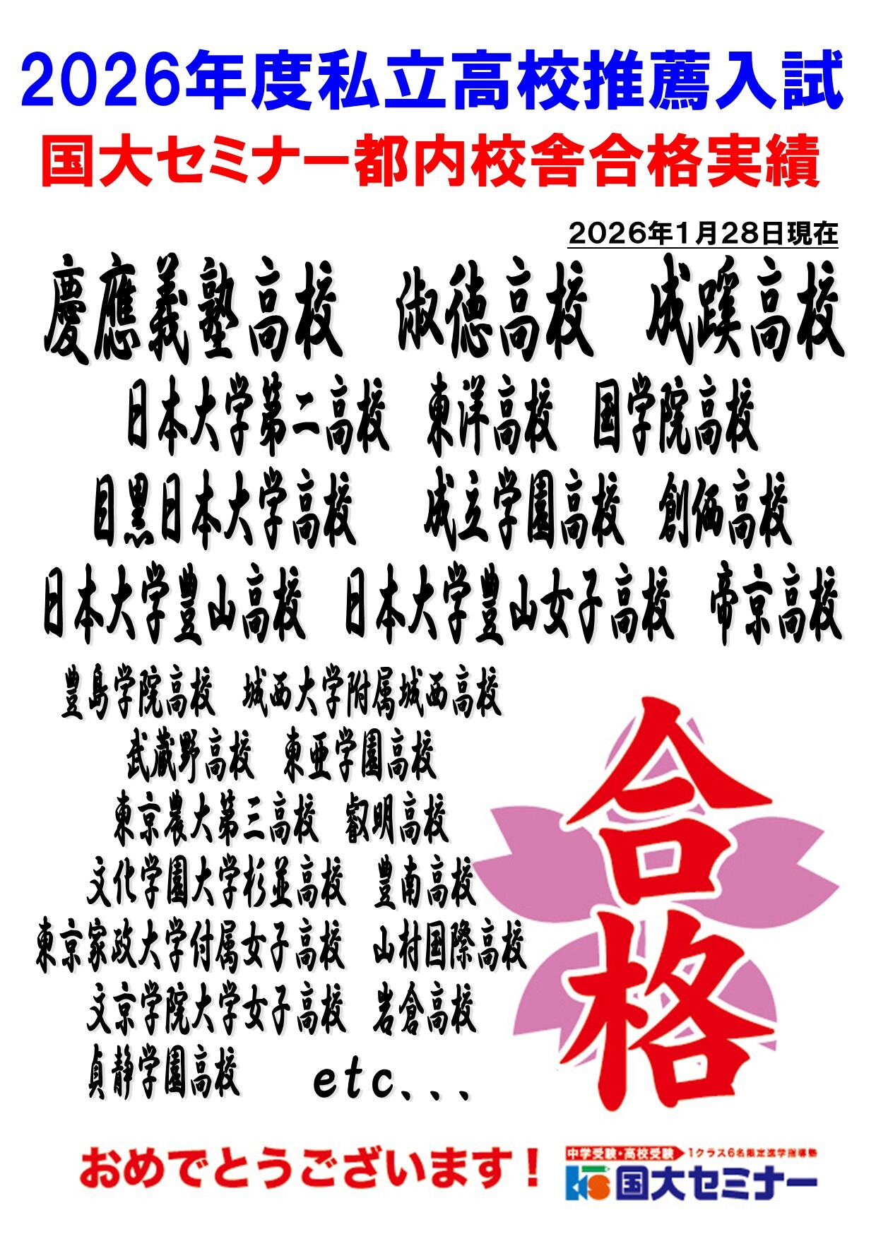 2023/02/16国大セミナー 大泉学園通り校の中学受験および高校受験の合格速報をお知らせいたします(2/15時点)。