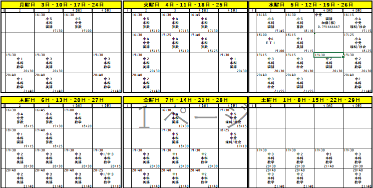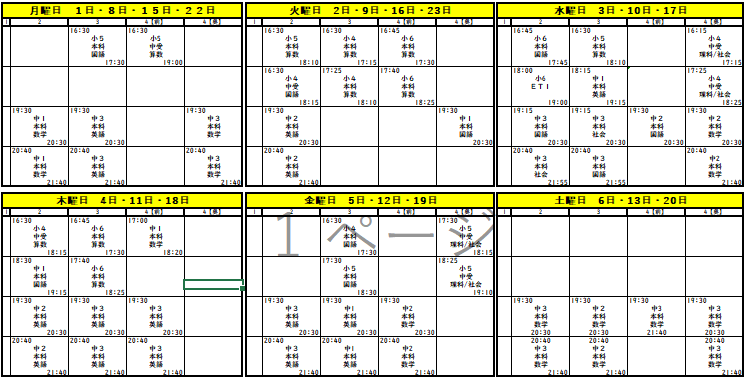 ※曜日によって学年・クラスが異なります。体験可能な授業の詳細については