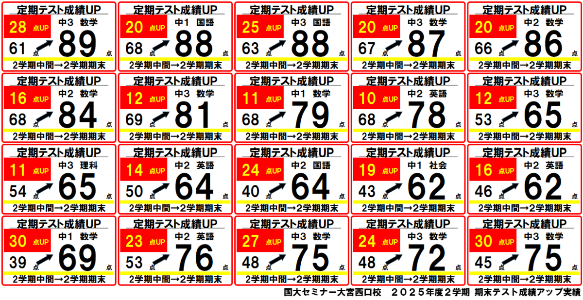 2025/12/13校舎近隣の中学校から国大セミナー大宮西口校にご通塾いただいている方々の、先月の定期テストでの点数アップを一部まとめました。