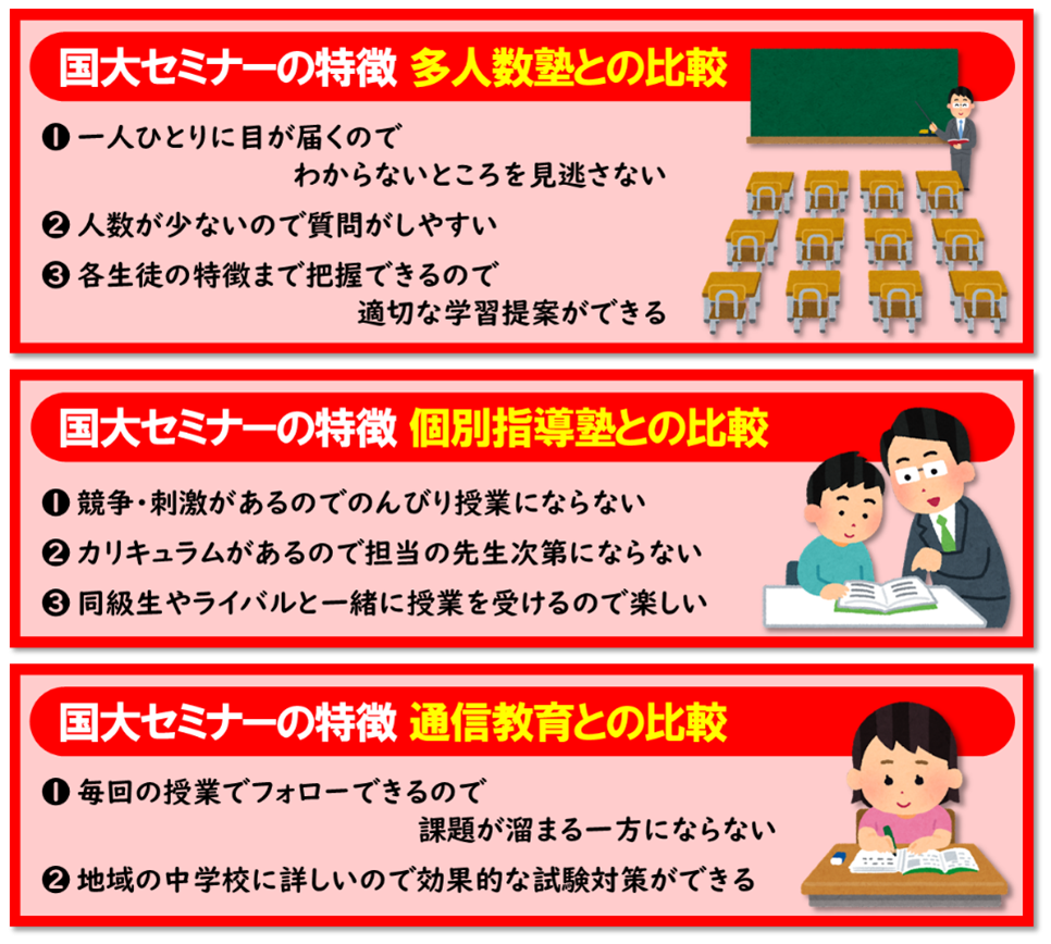 少人数制だから人数の多い教室とは違い、1人ひとりに合わせた対応ができる。少人数制だから個別指導とは違い、お互いに競争したり励ましたりできる。次は学年末テストです、皆で一緒に頑張りましょう。