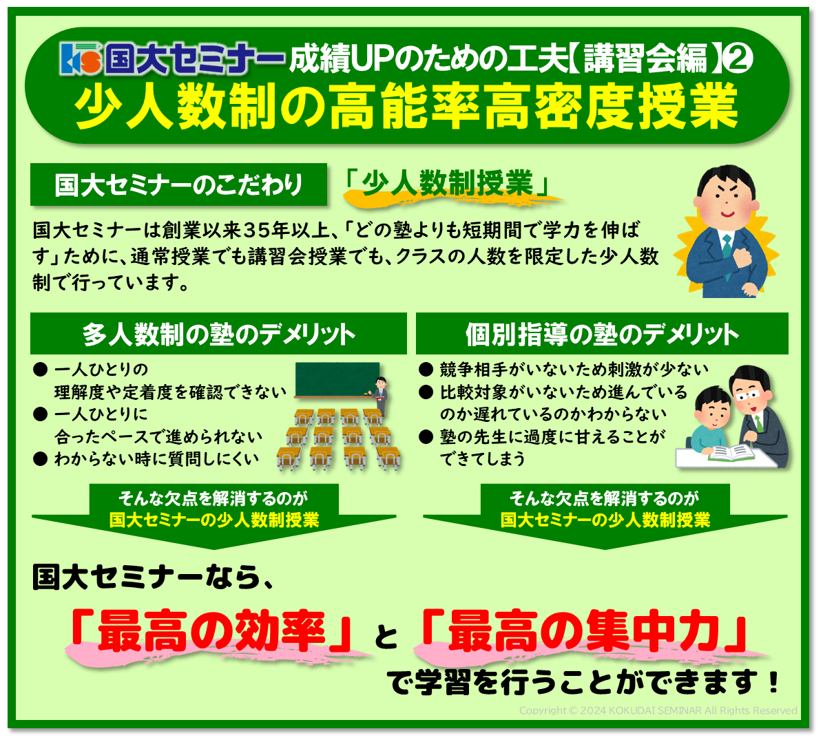 国大セミナーの少人数制授業は、単に“教える”だけではありません。生徒一人ひとりの状況を把握しながら進む。つまずきを即座に発見し、授業内で補強。クラス全体の理解度・スピードを考えた最適進行。これは、10名以上の集団授業でも、1対1個別授業でも実現が難しいポイントです。少人数制では、