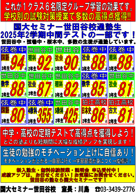 内申点、偏差値を上げたい生徒さんは国大セミナー世田谷校にお問い合わせください!