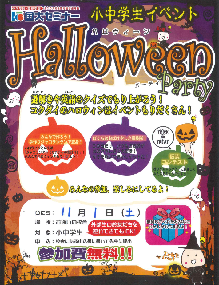 昨年に引き続き、今年も世田谷校では11月1日(土)にハロウィンパーティーを開催します!