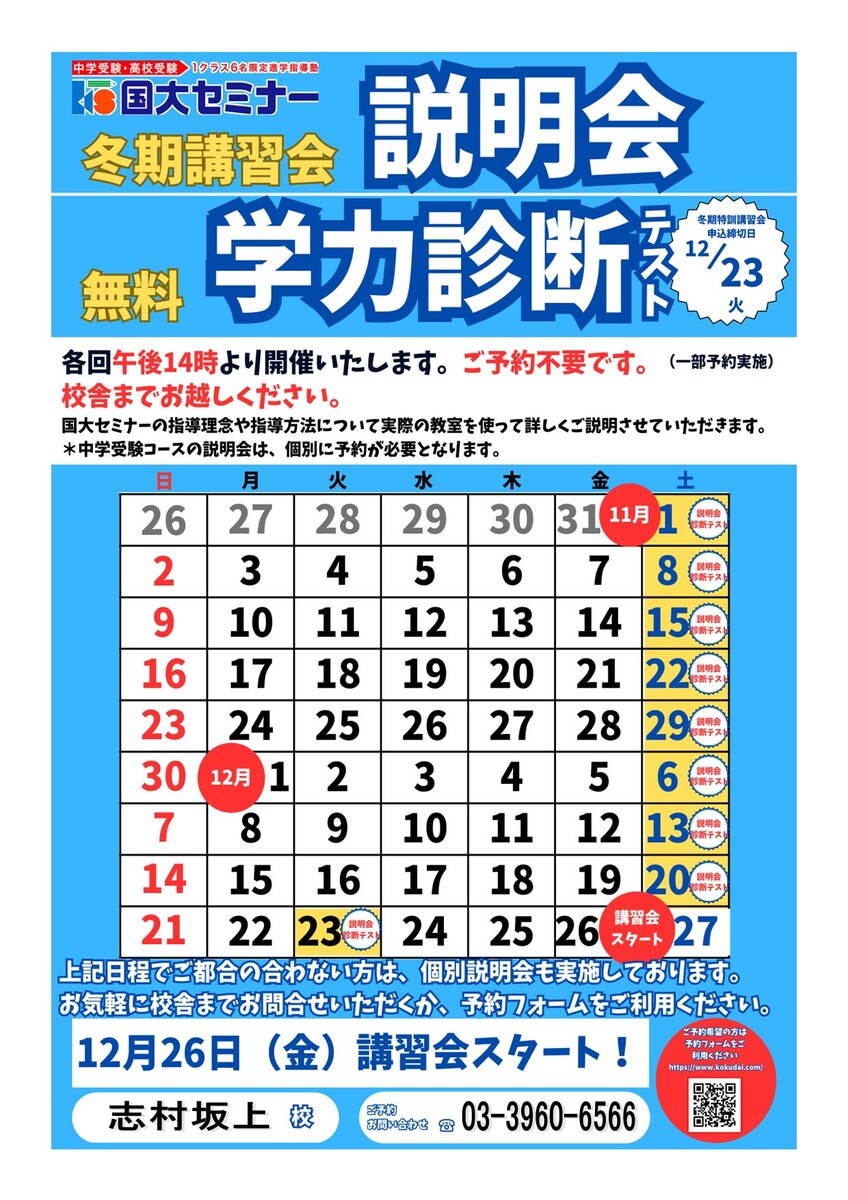 冬期講習会 説明会&無料学力診断テスト 予約受付中!