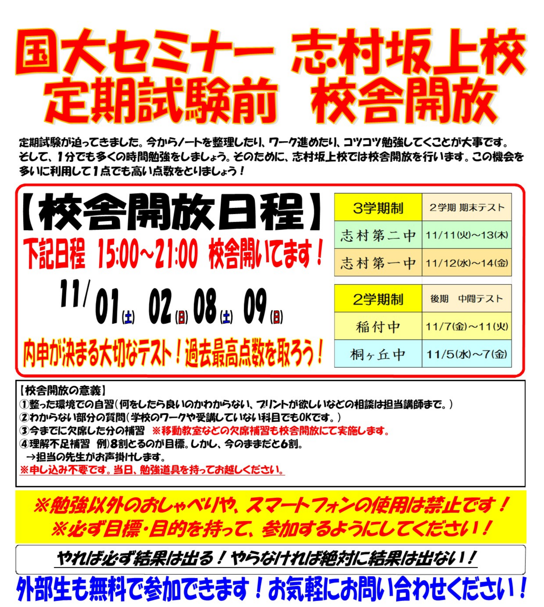 国大セミナー志村坂上校 定期試験前校舎開放