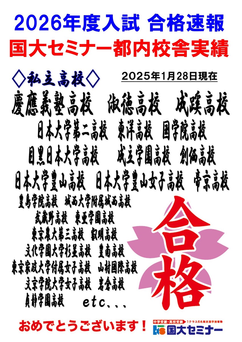 2026年度入試 国大セミナー都内校舎 私立高校推薦入試合格実績