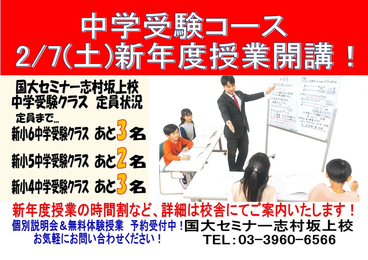 中学受験コース 新年度授業2月7日(土)開講!