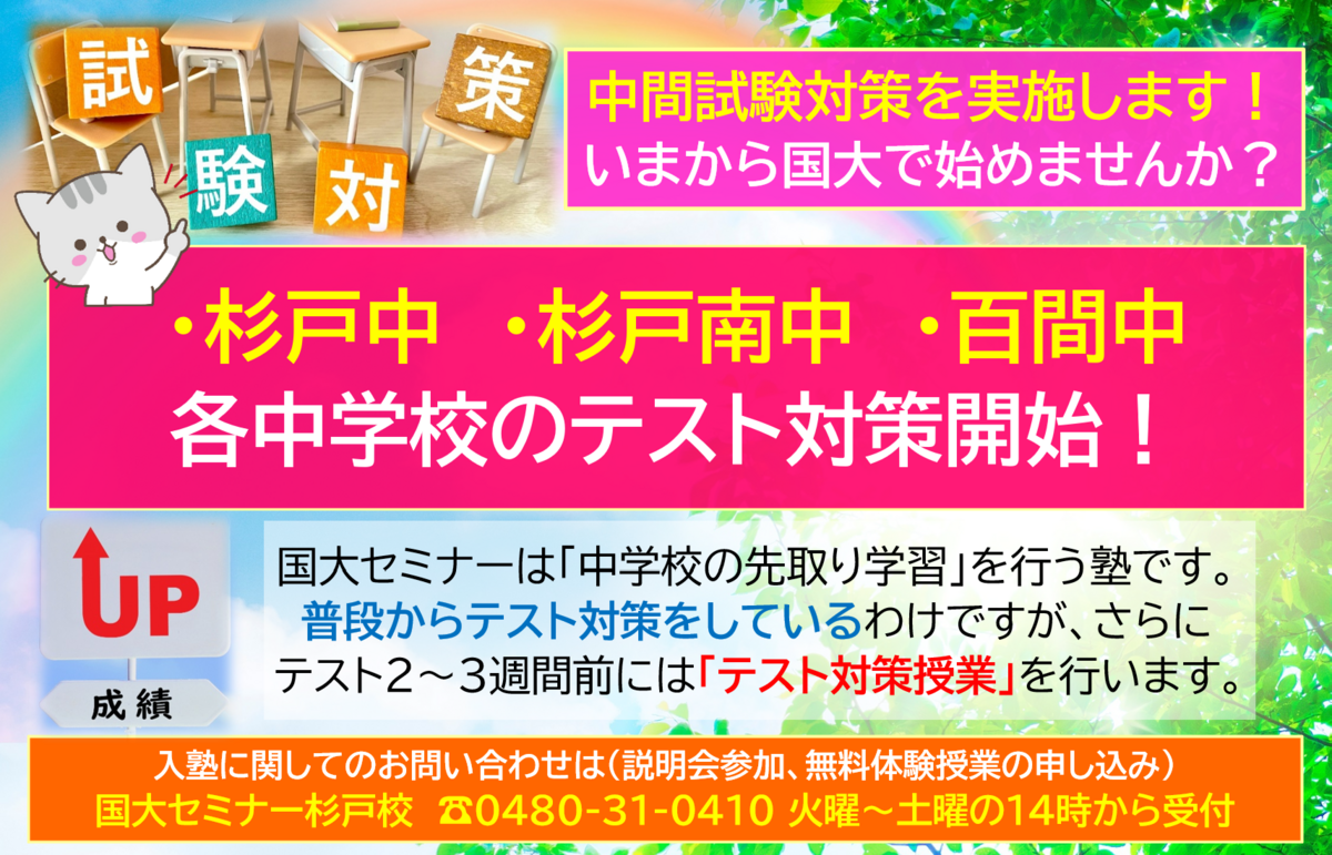 国大セミナーでは、各中学校のテスト「日程、範囲に合わせた対策授業」を開始しております。