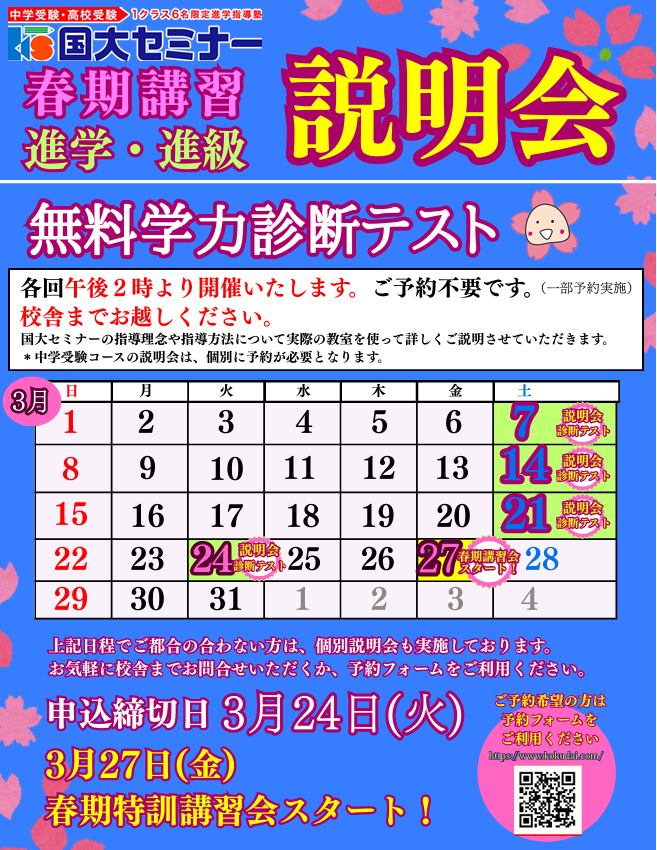 国大セミナーHPまたはお電話にてお問い合わせください。