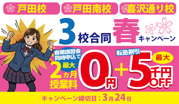 国大セミナー戸田南校では、戸田市校舎限定のお得な2ヶ月授業料0円キャンペーンを実施中です!