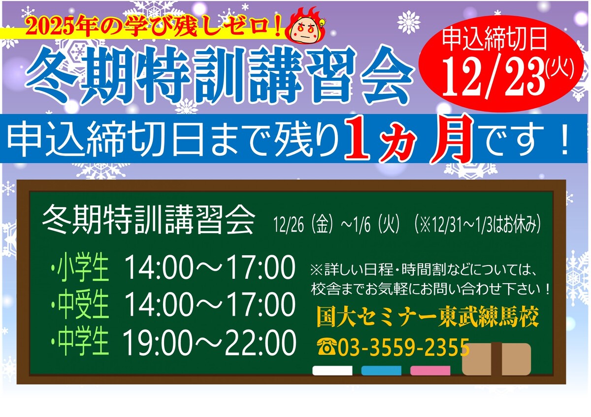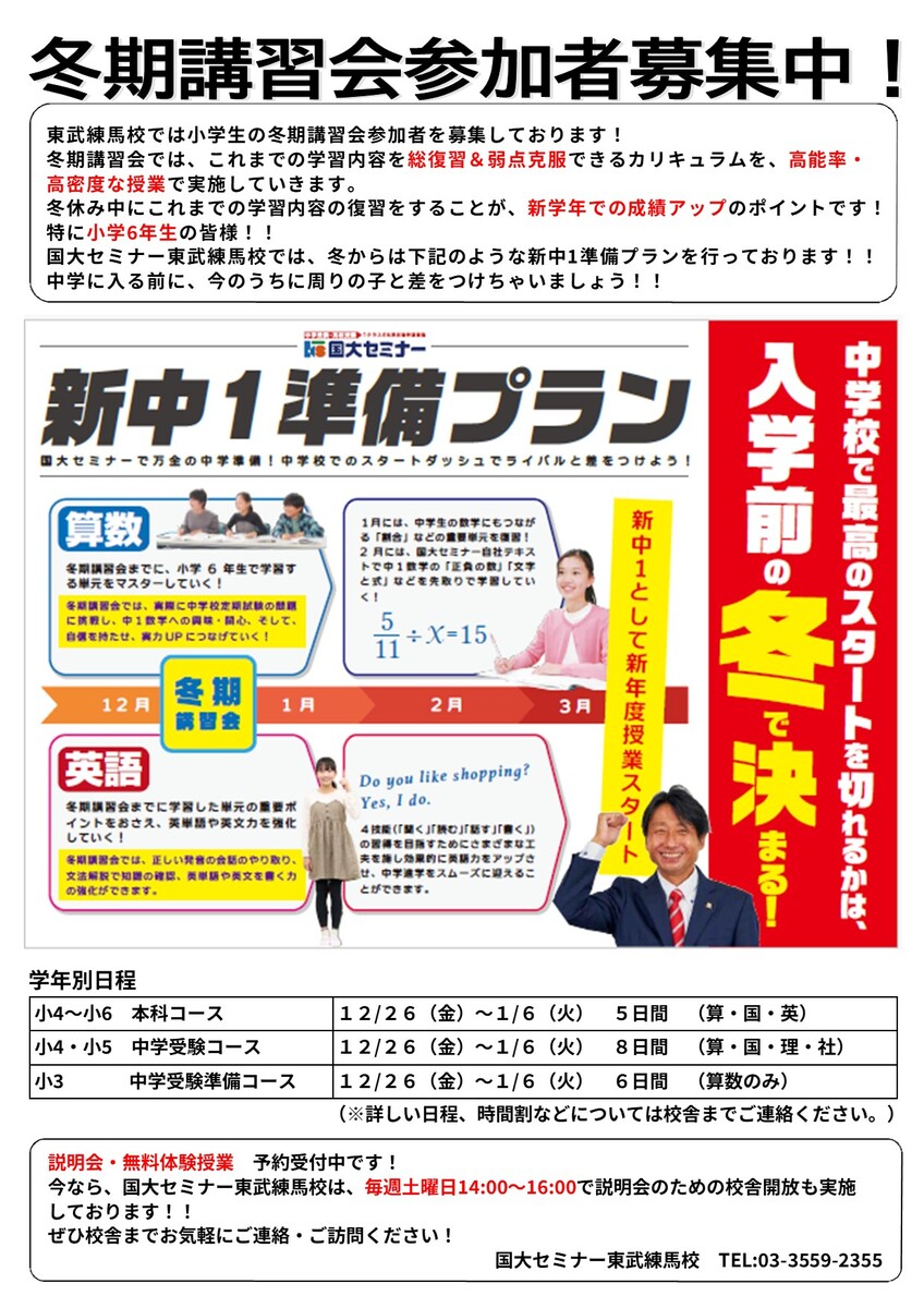 本日は、国大セミナーの冬期特訓講習会と中3・小6限定講座についてのお知らせです。
