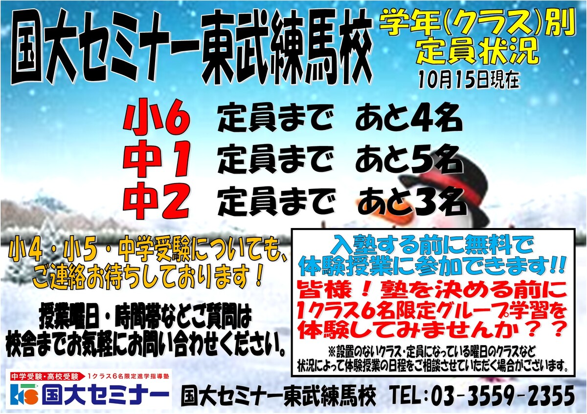 現在、冬期特訓講習会と中3・小6限定講座ともにお申し込みを受け付けております。無料体験や説明会も実施中 ですので、詳細については、お近くの国大セミナー各校舎へお問い合わせください。一人でも多くの生徒たちの成績アップと、志望校合格の後押しをさせていただけることを楽しみにしております!