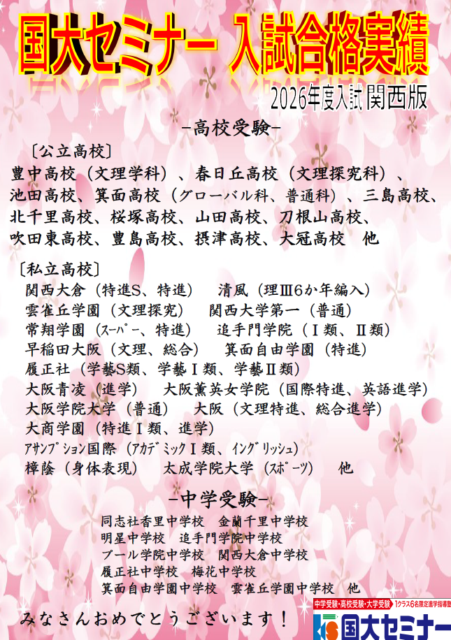 国大セミナー関西エリア の私立高校入試の合格速報 です!