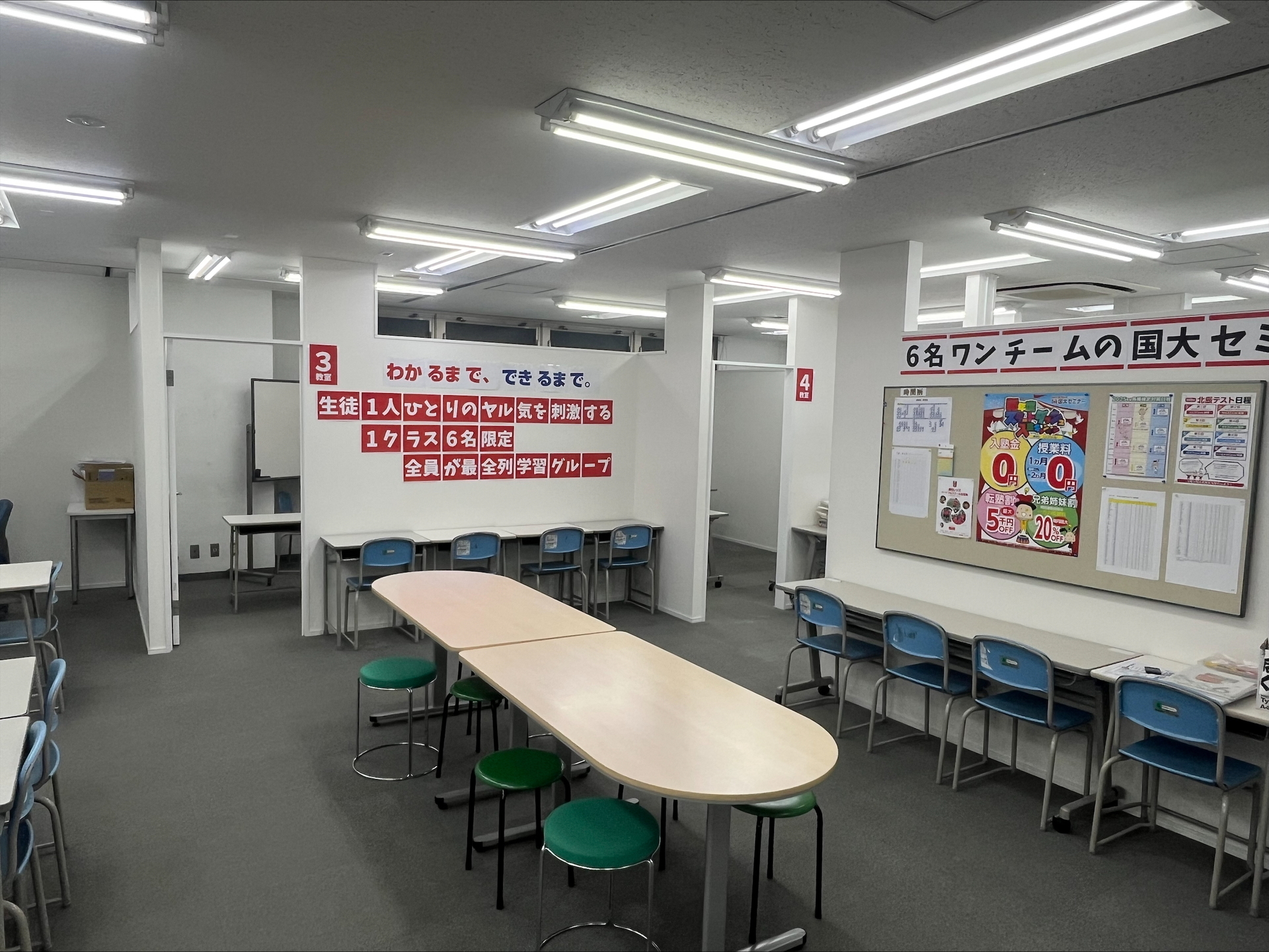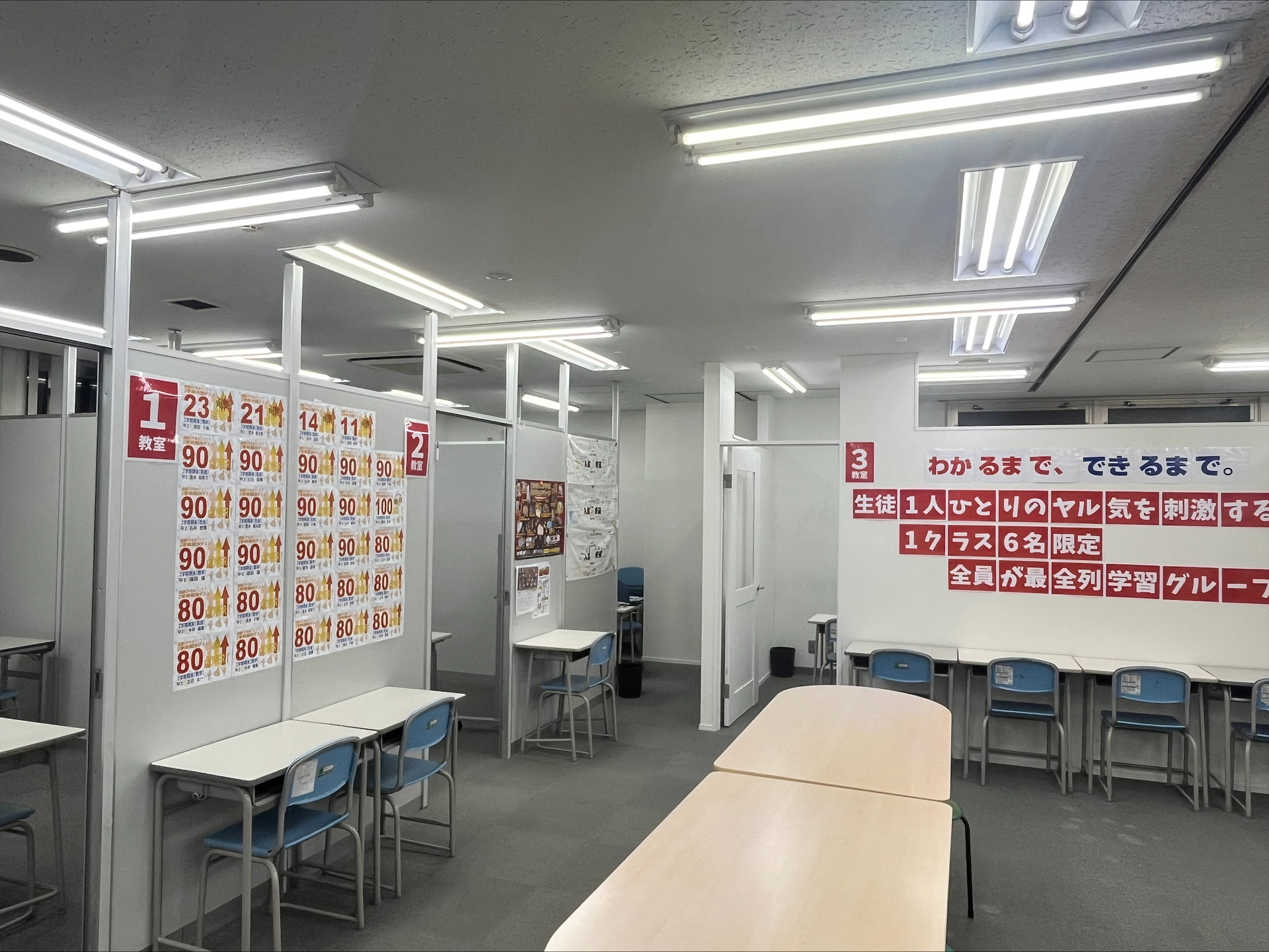【クラス全員が最前列】 L字型の机配置 により、講師は全員の表情の変化と手元の作業を見逃しません。一人ひとりのノートの取り方指導ができるとともに、躓きにいち早く気づけます。 また、少しでもわからないことがあれば、授業中にすぐに質問することができる距離です。