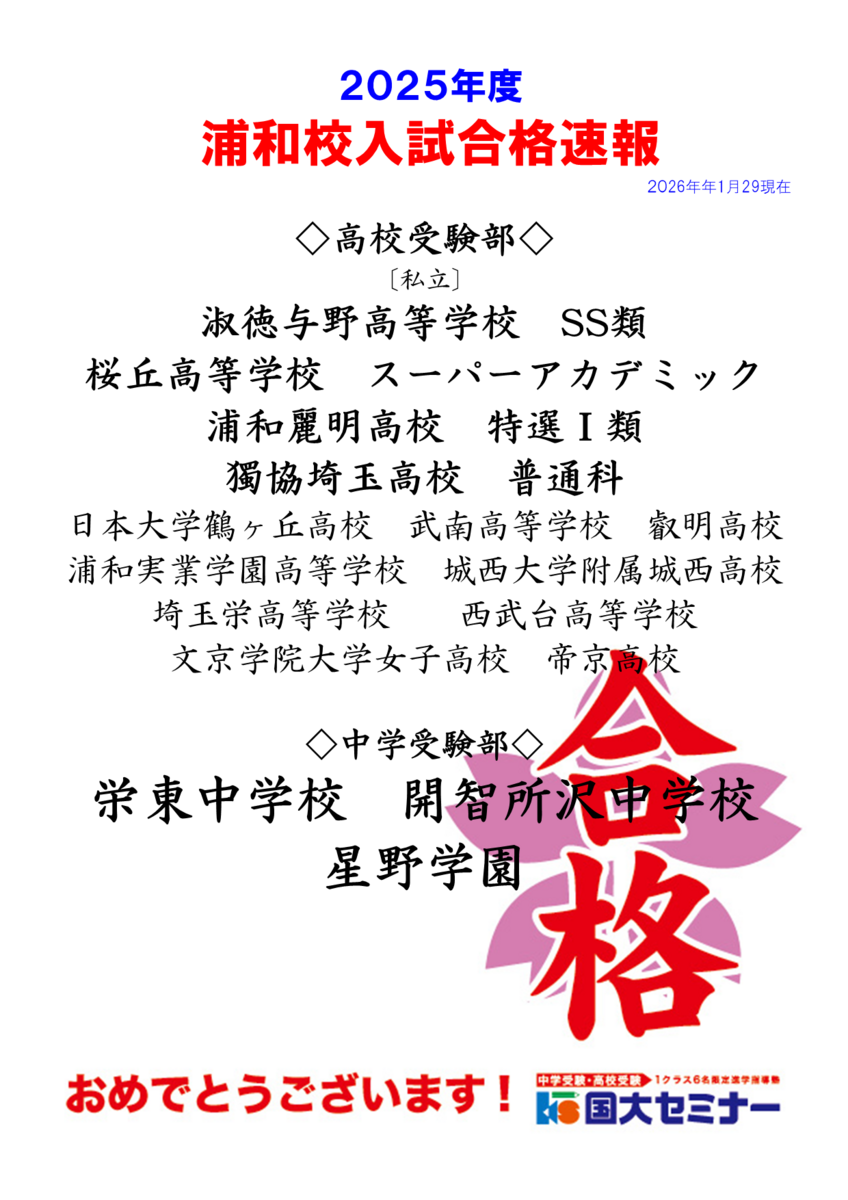 国大セミナー浦和校です。 2026年になって1か月が過ぎました。