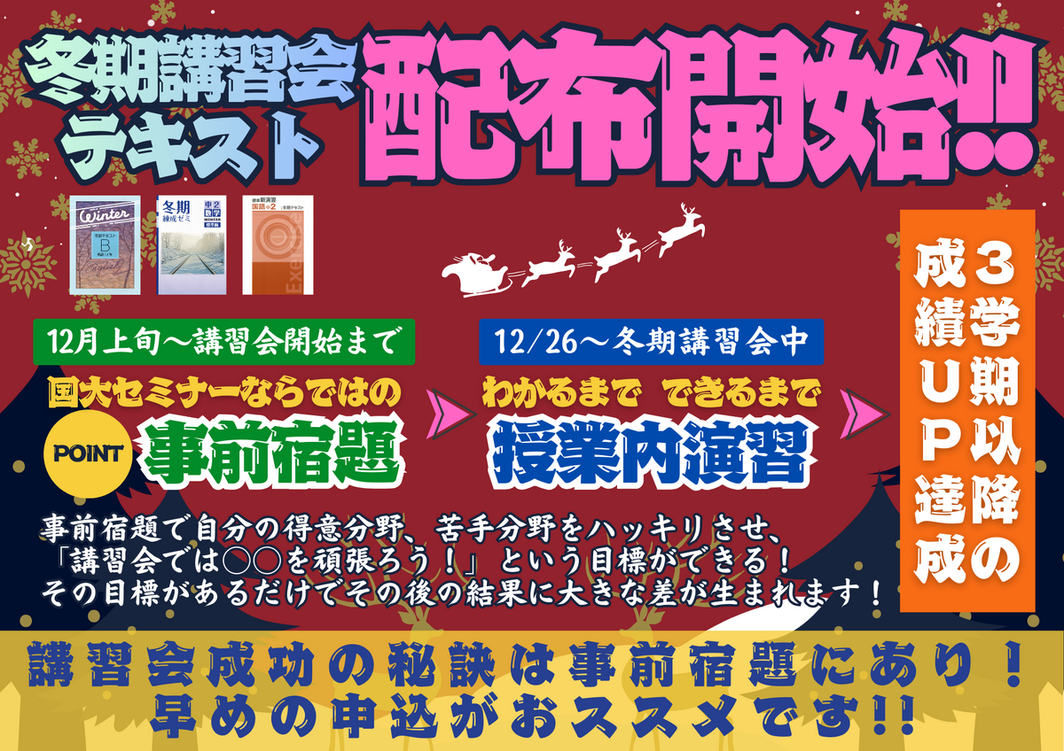 「冬期講習会」を検討されている皆さんは、「事前宿題」に取り組む時間を確保するためにも、なるべく早めにお問い合わせください!