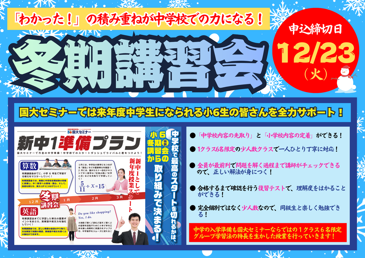 上記の通り、国大セミナー与野西口校では「小6完成プラス」を冬期講習会~2月にかけて実施をします。