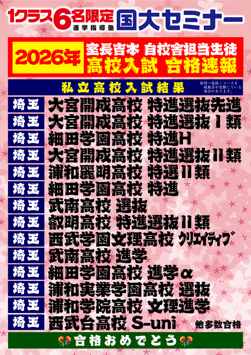 【与野駅西口|定期テスト・北辰テスト・高校入試】少人数制の成果、2026年度 私立高校合格実績