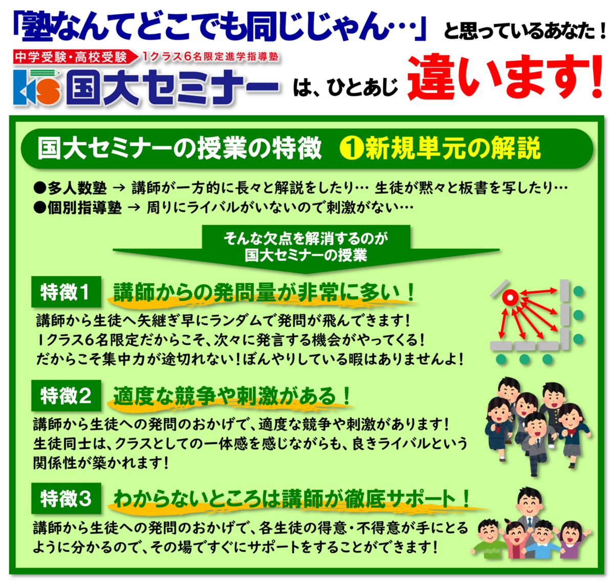 テスト対策に不安のある方はぜひ、1クラス6人までの少人数指導がウリの国大セミナーまでお問い合わせください!